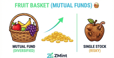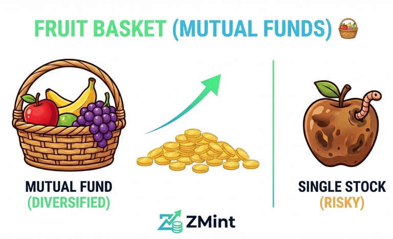 Buying one stock (like Zomato or Tata) is gambling. If it crashes, you cry. Mutual Funds are like a Fruit Basket. 🧺